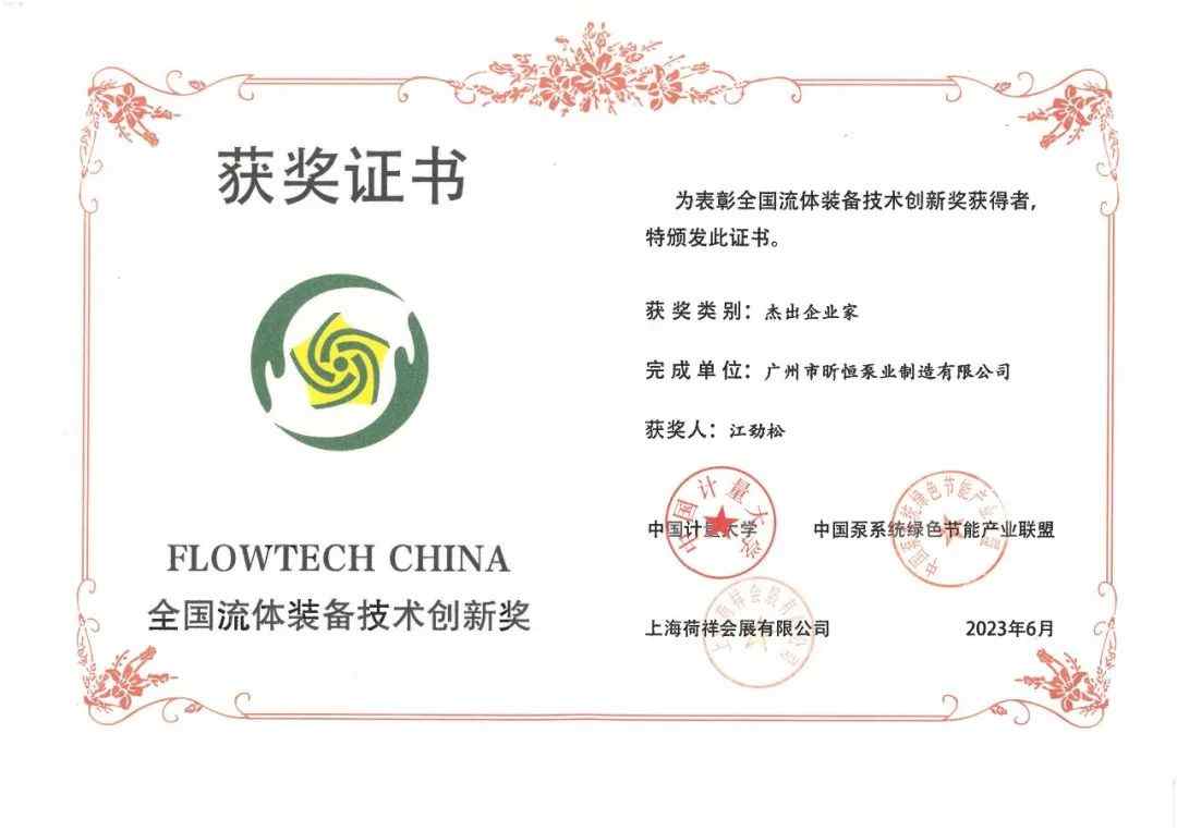為(wèi)發揮流體(tǐ)裝(zhuāng)備技(jì )術在國(guó)家創新(xīn)驅動發展中(zhōng)的作(zuò)用(yòng),提高流體(tǐ)裝(zhuāng)備領域的創新(xīn)技(jì )術,鼓勵和表彰在推進流體(tǐ)裝(zhuāng)備技(jì )術創新(xīn)中(zhōng)的先進單位和個人。6月5日,2023年第二屆FLOWTECH CHINA全國(guó)流體(tǐ)裝(zhuāng)備技(jì )術創新(xīn)獎頒獎典禮于上海召開。 昕恒泵業“一種高可(kě)靠性、長(cháng)壽命的長(cháng)軸泵及泵組關鍵技(jì )術研發”項目,獲評FLOWTECH CHINA全國(guó)流體(tǐ)裝(zhuāng)備技(jì )術創新(xīn)獎三等獎。 公(gōng)司董事長(cháng)江勁松,榮獲傑出企業家個人獎項。 本次榮獲全國(guó)流體(tǐ)裝(zhuāng)備技(jì )術創新(xīn)獎,是行業對昕恒泵業技(jì )術研發能(néng)力的肯定,也是公(gōng)司重視技(jì )術創新(xīn)、加大研發投入的體(tǐ)現。未來,昕恒泵業将貫徹落實公(gōng)司研發戰略,為(wèi)企業高質(zhì)量發 ...